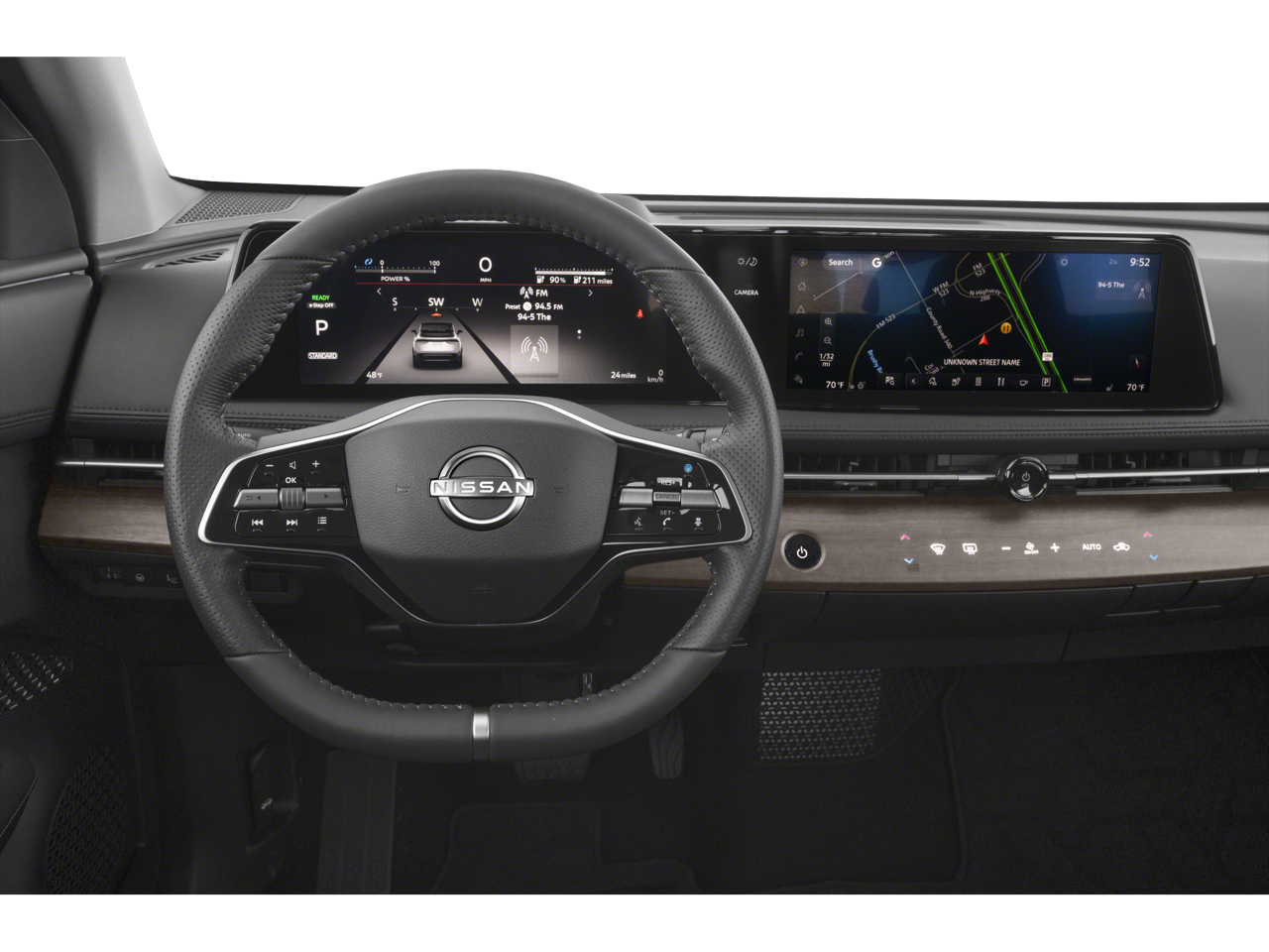 - Radio: AM/FM Audio System -inc: 12.3" color dual display, navigation w/voice recognition (english, french and spanish), 6 speakers, MP3/WMA playback, Bluetooth® streaming audio, speed-sensitive volume control (SSV), satellite radio pre-wiring, wireless CarPlay, tethered Android Auto, SiriusXM, SiriusXM Travel Link, NissanConnect EV, Bluetooth® hands-free phone system (w/voice recognition in english, french and spanish), voice destination entry (VDE) and hands-free text messaging assistant